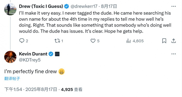8月19日讯 近日,杜兰特在推特上和网友互动。