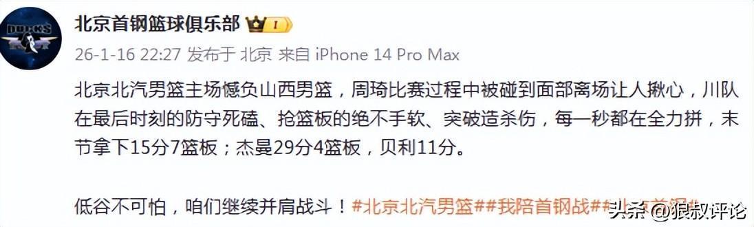北京时间1月16日,CBA常规赛继续开打,北京84-90不敌山西,过去4场比赛,北京输了3场,而第四节崩盘引发外界的热议,大量的球迷冲到北京社媒评论区表达不满。